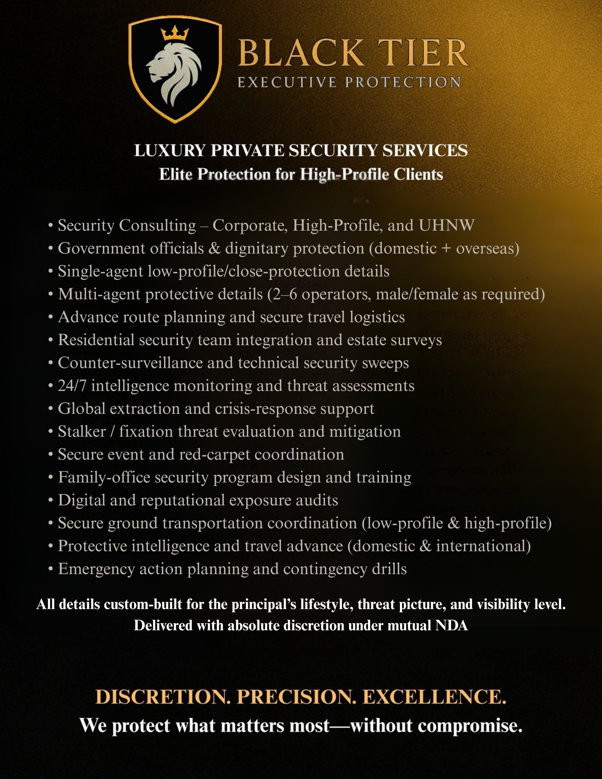 “Professional, discreet, and incredibly capable. Their team made us feel secure without ever being intrusive. Worth every dollar.”
